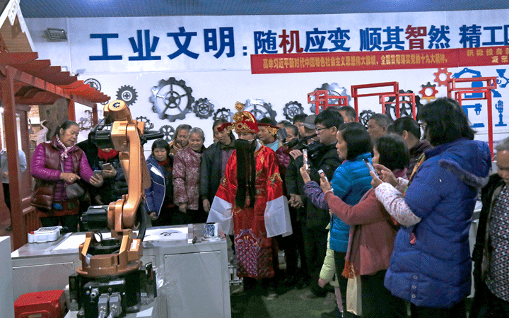 活動(dòng)現(xiàn)場,匯興智造黨支部、工會(huì)委員會(huì)、團(tuán)工委等工作人員裝扮成財(cái)神為老人送上新年利是,陪伴老人一同參觀匯興智造工業(yè)4.0智能裝備體驗(yàn)館,體驗(yàn)智能制造“隨機(jī)應(yīng)變”“順其智然”改變傳統(tǒng)生產(chǎn)的魅力;觀看由匯興智造員工自編自演的京劇舞蹈廠歌等文藝節(jié)目,感受匯興智造“用情做人、用心做事”,“敬天愛人,孝道為先”的文化力量。